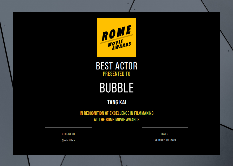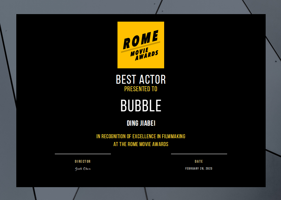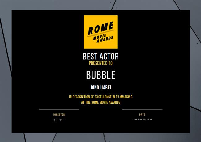 电影《泡泡》的制作历时近2年,该电影已在罗马国际电影节、欧洲独立电影节、纽约国际电影节中获得“最佳儿童短片电影”“最佳男主短片”“最佳摄影”“最佳声音制作”“最佳海报”等多项国际奖项。