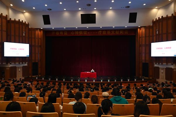 讲座上,徐雁提出阅读是一座避难所,可以疗愈身体,求取知识和学问,可以健美心神,应是现代人精神文明生活的追求。“最是书香能致远,读书身健方为福。”徐教授从独特的人文关怀和美学内涵的解读推荐了“疗愈系”书目,并建议图书馆创建有特色的“疗愈系”文献。