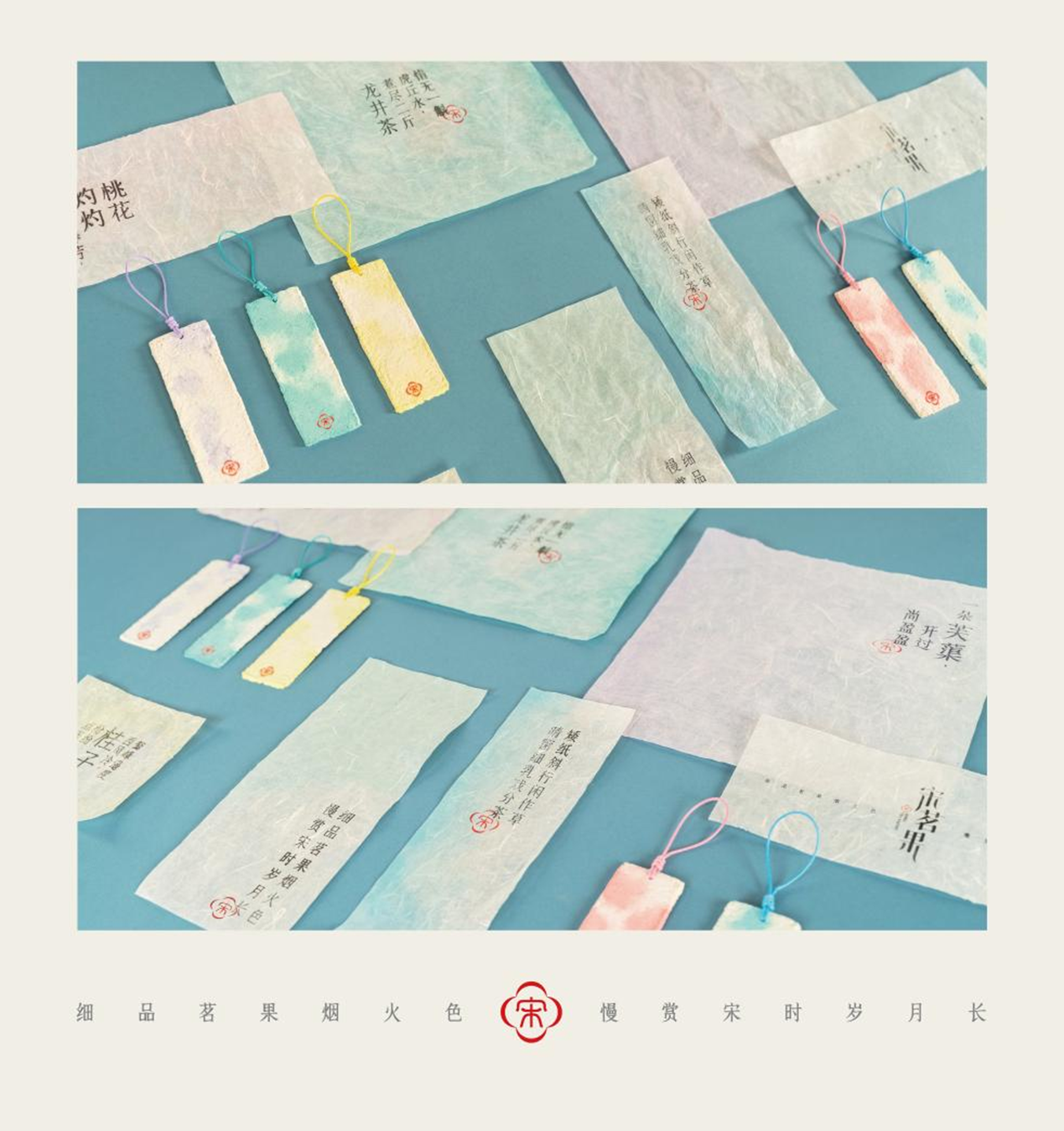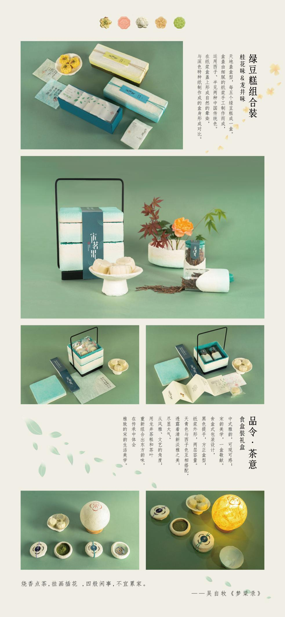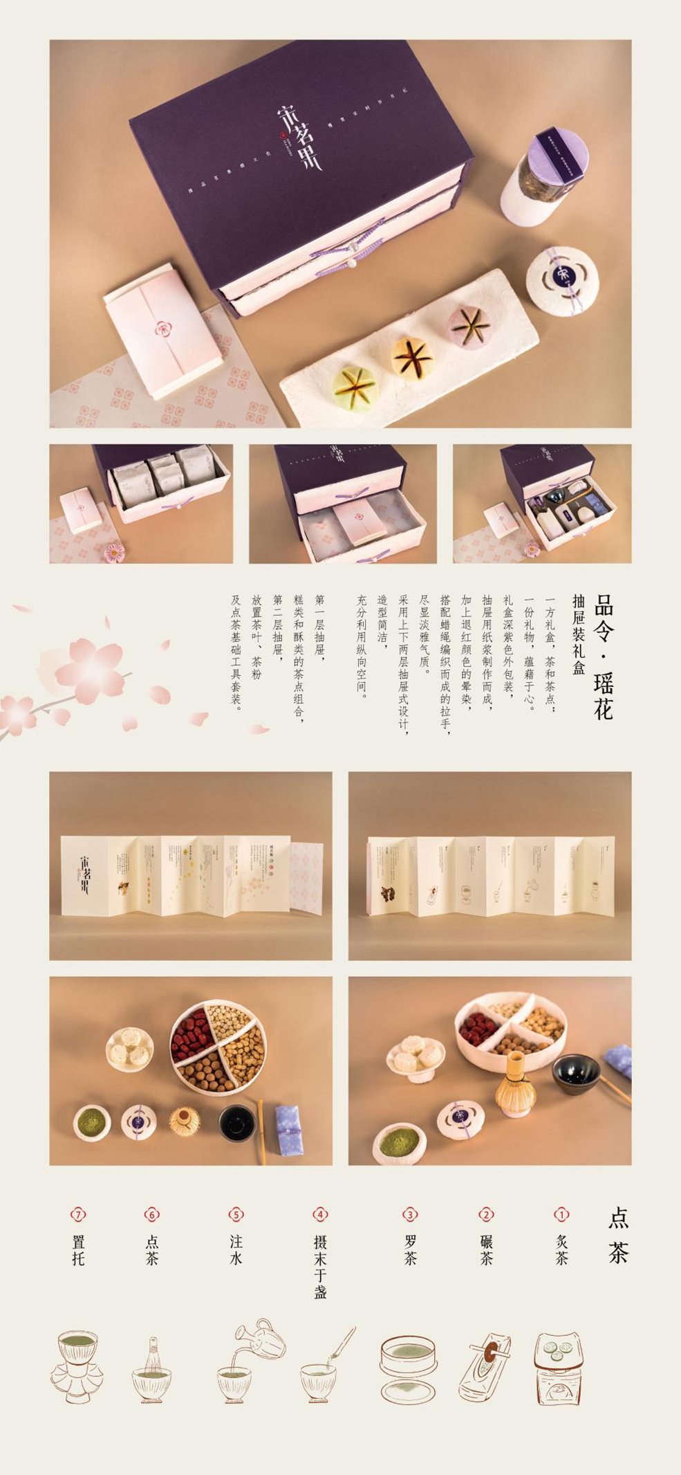 设计说明:本课题项目以宋韵文化为背景,打造了一个中式茶点自创品牌——“宋茗果”。在包装材料上选择可塑性较强且环保的纸浆,运用纸浆塑型工艺制作包装容器,提高了保护性和可重复使用性。纸浆有明显的肌理感,搭配一系列从宋代五大窑中提取的色彩,如“暮山紫”“西子”等,使包装有古朴素雅的质感。包装主要盒型有四种:天地盖和抽拉式的中包装,以食盒为原型的小礼盒装和抽屉式的大礼盒装。此外根据宋代四艺,还制作了建盏、焚香盒、花瓶等衍生品,使人们感受到宋代独具韵味的生活美学。