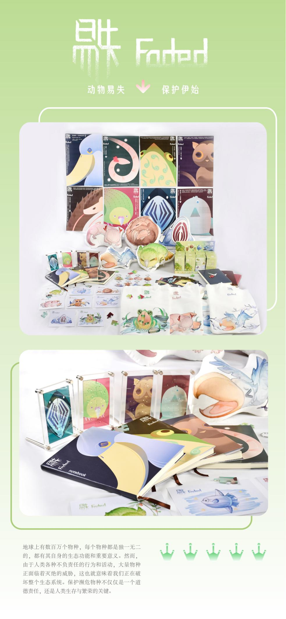 设计说明:大自然创造了许多美丽可爱、富有灵气的生命,但随着社会的极速发展,大量的生灵由于自然灾害、人类经济活动、栖息地的急剧变化、猎杀等原因濒临灭绝,令人痛惜。本主题以濒危动物保护为切入点,采用多元化的手法重塑濒危动物形象,通过文创设计的形式向大众普及濒危动物知识。作品通过抽象几何风格的海报、卡通萌系插画、动物信息科普可视化图表、live2D游戏互动、3D角色盲盒等表现形式,将二维与三维多媒体技术结合,以丰富新颖的视觉表现形式来呼吁社会对该话题的关注。