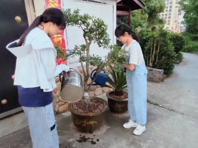 在五一劳动节的这天,我和我的妹妹一起将家门前的植物们松土和浇水,照片中我和妹妹一人一个洒水壶,需要去对面的池塘将水灌满。没想到小小的一个水壶灌满后这么沉,我们来来回回灌了好几次。我们发现每一盆植物都是需要很多水才能够的,还由于很久没有松土的原因,土变得有些硬,不过在我们的帮助下,它们又变得松软适宜了,这次劳动非常有意思也很锻炼我们。