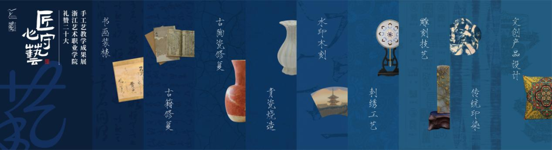 线上展厅共分为十一个板块,涵盖古陶瓷修复、古籍修复、书画装裱、青瓷烧造、传统印染、刺绣工艺、水印木刻、雕刻技艺八个技艺教学成果以及非遗文创产品设计、非遗传承人群研培、优秀校友作品等。