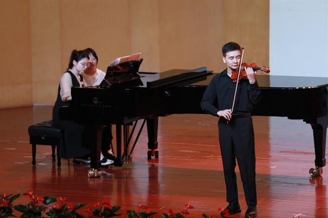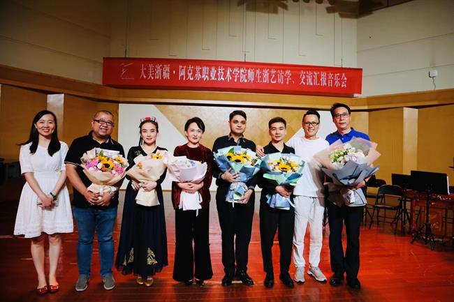 音乐学院院长吴樟华同师生代表一同回顾了三个月以来,西尔扎提江·依力哈尔老师与玉米提·阿里木同学在专业学习上情况,各类艺术观摩、实践演出、研学交流,形式多样,内容丰富,尤其是在“大美浙疆”——阿克苏职业技术学院师生访学、交流音乐会上,三位师生与音乐学院的教学团队一同展现了大美浙疆的艺术文化交融,艺术教育互学互鉴,民族情谊悠久绵长。
