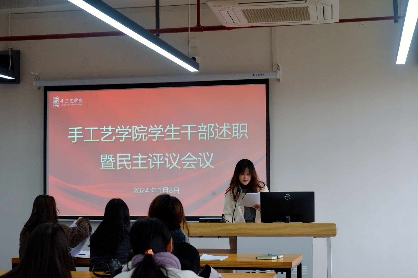 为深入学习贯彻习近平新时代中国特色社会主义思想,合力推进团学标准化建设,纵深推进团学改革,1月8日下午,手工艺学院召开学生干部述职暨民主评议会议。会议由手工艺学院团总支书记方雯静主持。