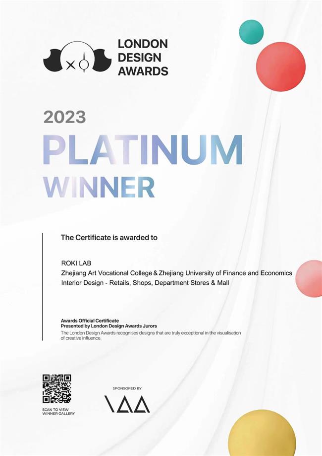 该作品荣获2023伦敦国际设计室内设计:零售,商店,百货公司和购物中心类铂金大奖。伦敦国际设计奖(London Design Awards)作为国际奖项协会(IAA)旗下的全球性奖项赛事之一,该奖项面向建筑、室内、产品、包装、视觉传达、服务、用户体验等广泛领域征集设计作品,致力于表彰在视觉化方面具有创意影响力的卓越设计。