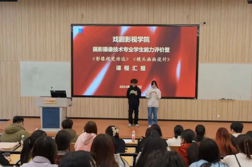 《镜头画面设计》《影像视觉传达》是戏剧影视学院摄影摄像技术专业的核心课程。为检验教学成果,提升专业教学质量,1月12日下午,戏剧影视学院摄影摄像技术专业学生能力评价暨《影像视觉传达》《镜头画面设计》在阶梯一教室举行。戏剧影视学院院长那刚、党总支书记许瑛、副院长徐旭恒及相关教师参加。2022级摄影摄像平面班、2023级摄影摄像专业全体学生进行课程汇报。
