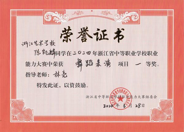 附中2019级中国舞班陈凯麟喜获2024年全省中职比赛 “舞蹈表演”赛项一等奖第一名