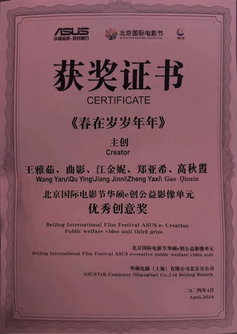 近日,北京国际电影节华硕e创公益影像单元颁奖典礼在北京举行,由我校戏剧影视学院影视编导专业教师陆岸指导,2020级影视编导专业学生夏金莹、陈景慧、陈奕纡、李雨茜、覃飞凯创作的故事短片《水长东》荣获该竞赛单元三等奖,2021级影视编导专业学生王雅茹、曲影、江金妮、郑亚希、高秋霞创作的故事短片《春在岁岁年年》荣获优秀创意奖,陆岸获优秀指导教师奖。