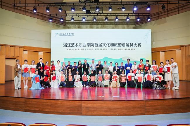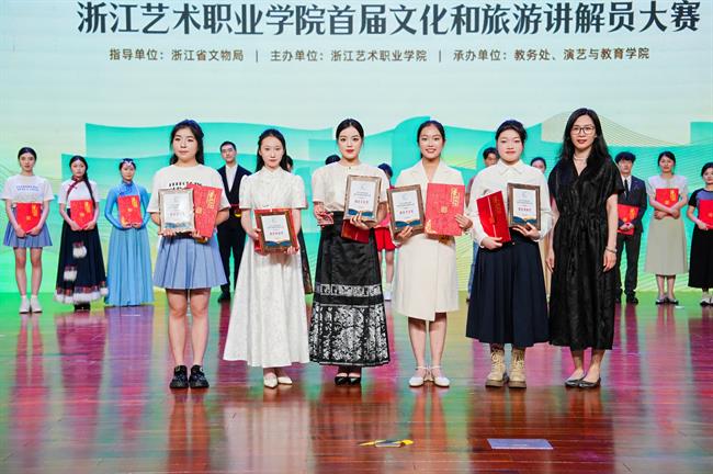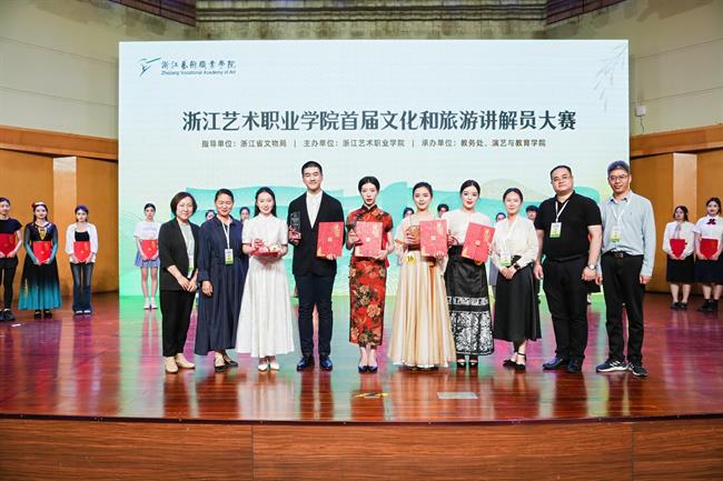 本次大赛分景区、旅居、文博、红色四大主题。决赛现场,各位参赛选手结合主题内容,模拟工作实景,发挥专长,各展风采。在命题讲解环节,选手们精神饱满,以自己的视角和见解,通过视频、PPT、实物展示等多种形式将各自选定的主题生动呈现:有的带领听众漫步于古色古香的江南水乡,讲述景区的自然之美与人文故事;有的则以旅居为主题,描绘了一幅幅旅人与自然和谐共生的美好画卷;更有选手深入浅出地剖析文博藏品背后的历史脉络,让静默的文物说话;而红色主题的讲解,选手们用铿锵有力的话语,讲述了一个又一个鲜活感人、荡气回肠的故事,再现了革命先辈的英勇事迹,传递着不灭的红色精神。风采展示环节,选手们则是使出了浑身解数,说、演、弹、唱、舞、书、画样样精彩,呈现出自己的独特风采与魅力,充分展示了浙艺讲解员的赞与精。