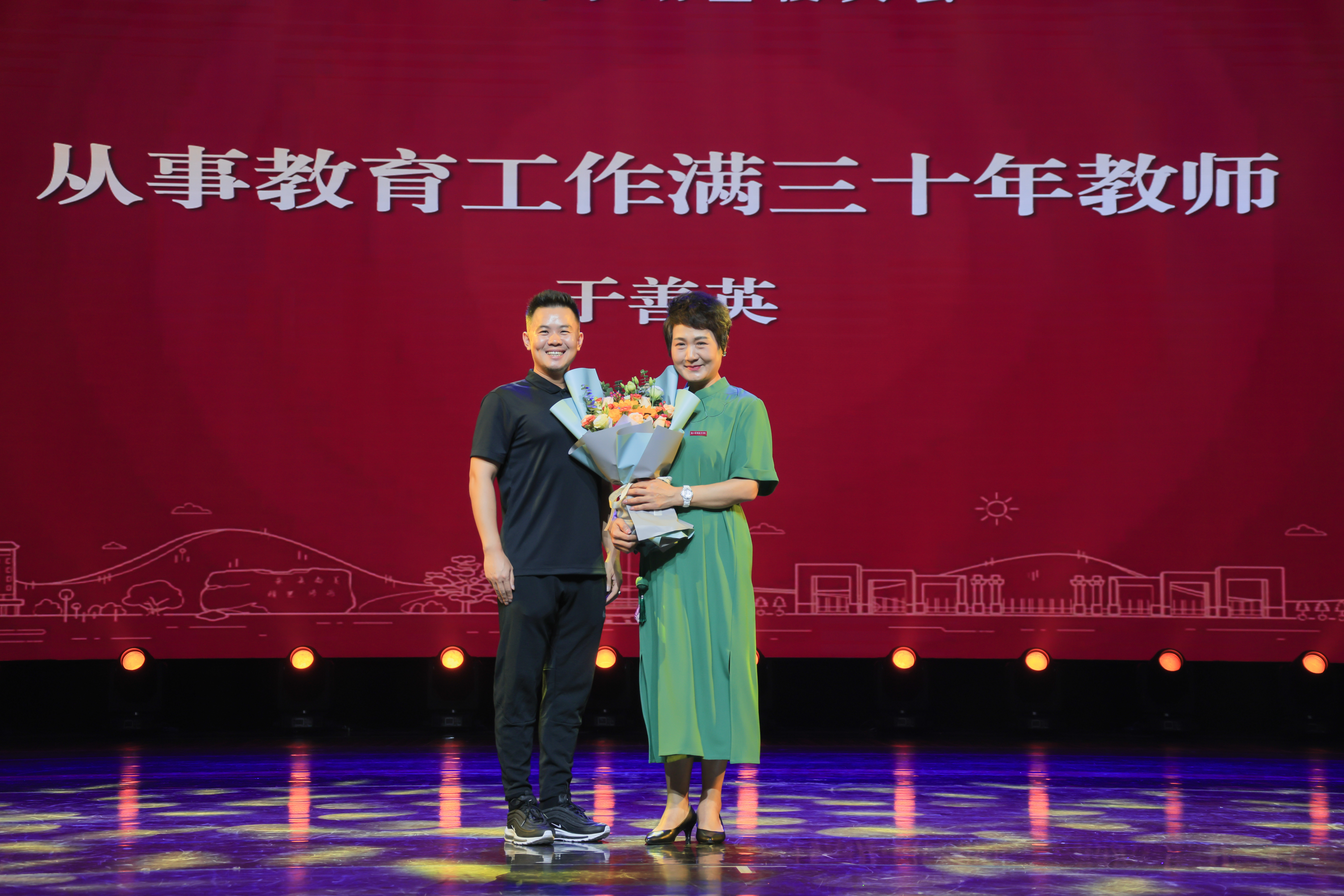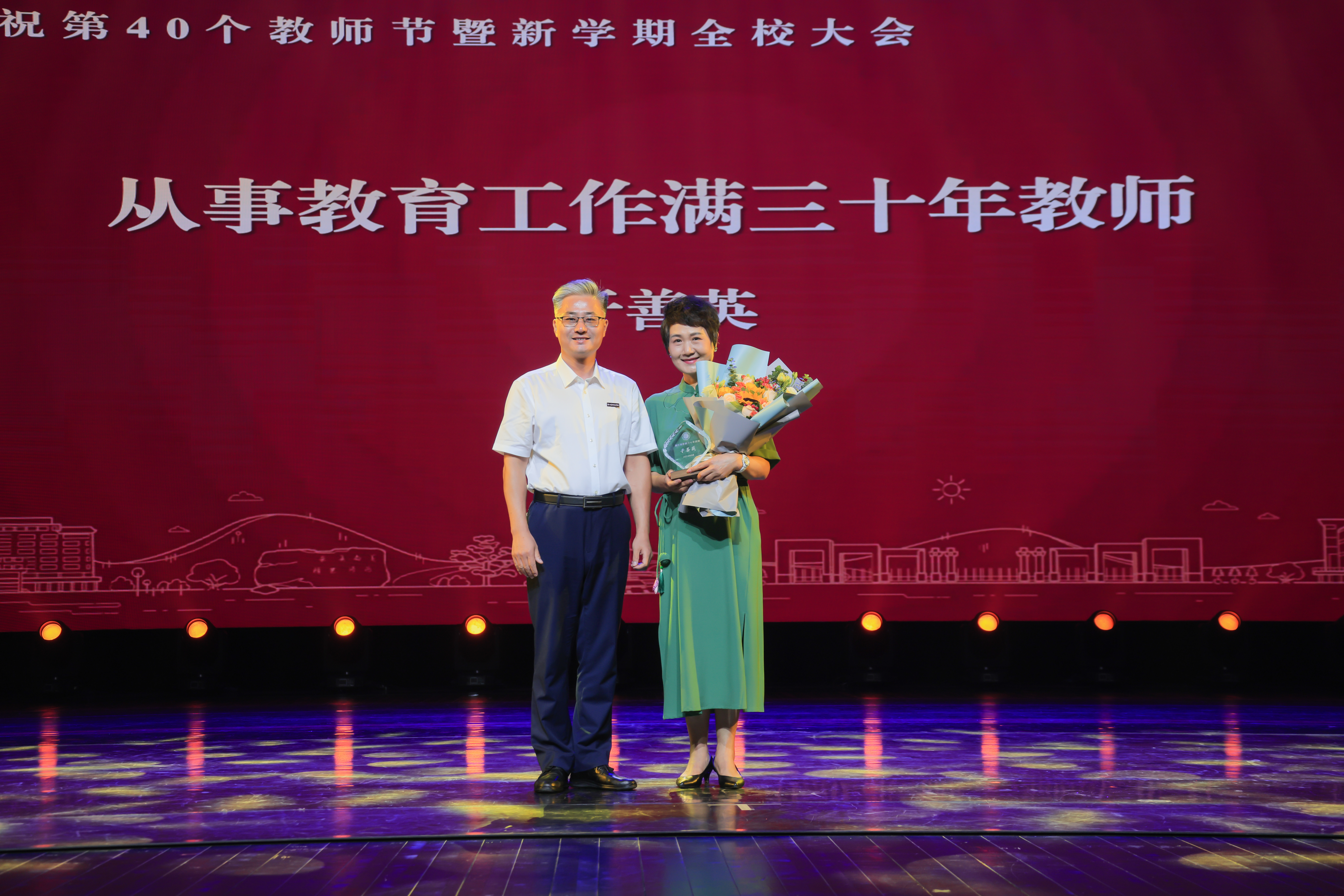 ▲党委书记薛亮向30年教龄教师于善英颁发纪念牌