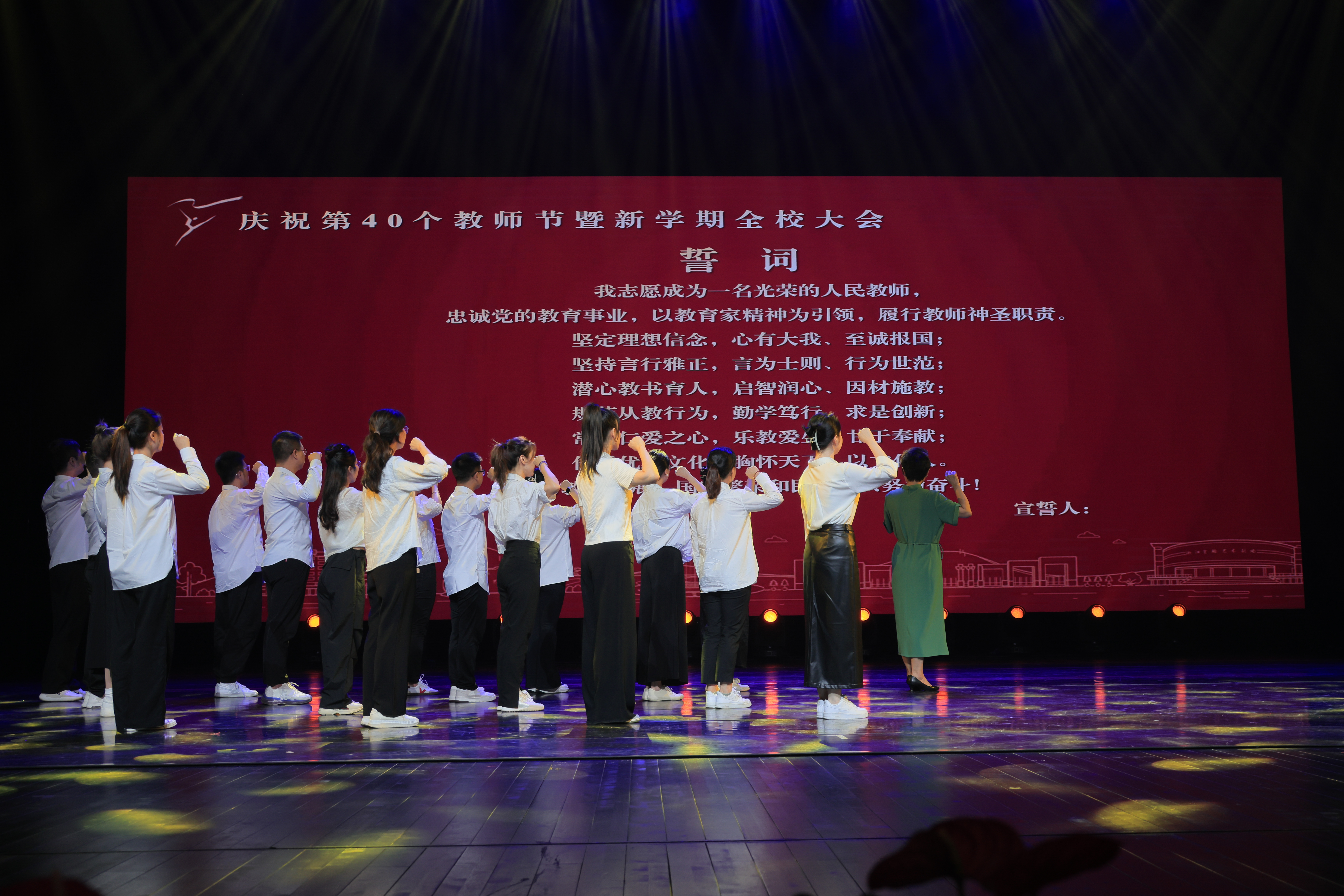 大会为30年教龄教师颁发纪念牌。在热烈的掌声中,音乐学院教师于善英用自己一生从事艺术职业教育的感想与感悟,表达了对教育事业的热爱与坚守以及对学校发展的美好祝愿。17名新进教师在于善英的带领下进行了入职宣誓。作为新浙艺人,他们将立志以自己青春和热血,为学校新一轮的高质量发展注入新的活力,为全体浙艺人的美好明天贡献新的力量。