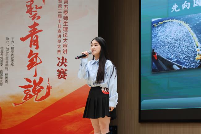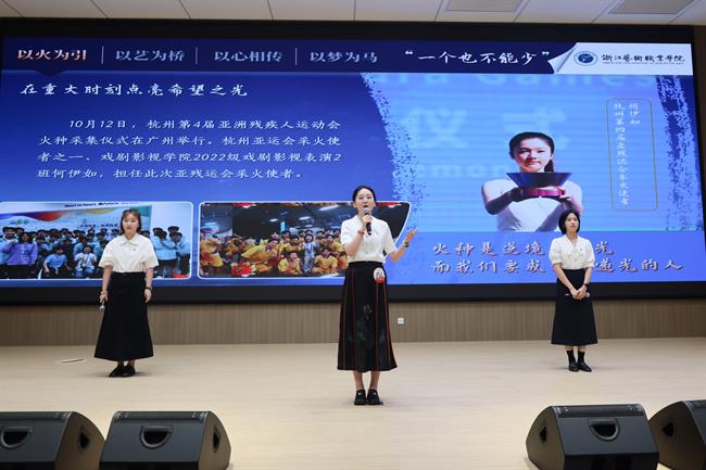 手工艺学院党总支的金语涵结合浙江象山的变革,生动解读了“建设美丽中国”的重要内涵。舞蹈学院党总支的姚璐结合中国传统舞蹈《舞韵东方》,传达了“以舞为舟,载浙艺风华渡重洋”的理想。手工艺学院党总支的林维业从马来西亚的多元文化切入,传达“做传统的守护人,当创新的摆渡者”的信念。戏剧影视学院党总支的何颖、陈洁、苏昱蒙呼吁大家关注、关心残疾人,让每个生命都被“看见”。戏曲学院党总支的李运靖结合自己在美国宾汉顿大学戏曲孔子学院的志愿工作经历,以戏曲为媒,弘扬中华优秀传统文化。演艺与教育学院党总支的俞晶晶、王柳词以图文并茂的形式生动, 再现了仙居、武义文化推介官合力推介地方文旅的场景。马克思主义学院直属党支部的曹佳艺从“政治导师”“学习导师”“人生导师”三种角色入手,解读了“用思政匠心 育时代新人”的深刻内涵。戏曲学院党总支的杨茜讲述了三代戏曲人薪火相传的成长故事。手工艺学院党总支的杨之圣从自身经历出发,传达了“守卫物质家园,守护精神原乡”的初心。基础部附中联合党总支的项天歌呼吁“以青春之名,赴时代之约”,号召浙艺学子在浙艺精神中寻找成长坐标。演艺与教育学院党总支的郑佳妮、陈姝言结合学校发展历程,将浙艺人以艺术为舟、以初心为帆的故事娓娓道来。设计学院党总支的朱程诚结合浙艺台前幕后的故事,歌颂了浙艺人的匠心与创新。舞蹈学院党总支的叶滢滢结合一段与信仰有关的舞蹈旅程,表达与信仰共舞、与祖国同频的使命。舞蹈学院党总支的谭雨旋从一名舞蹈老师的“浙艺答卷”入手,以自身经历讲述托举与传承的意义。戏剧影视学院党总支的赵泽杭从共和国的第一声播讲切入,呼吁浙艺学子“用声音传递信仰,以话筒赓续荣光”。演艺与教育学院党总支的王楚瑶从义乌市陇头朱村“稻虾轮作”项目切入,讲述了乡镇文化员“钳”住新密码、“义”起话共富的新时代故事。音乐学院党总支的宋珊瑚从《黄河大合唱》《黄河颂》两首歌切入,呼吁浙艺学子延续黄河血脉,传承浙艺精神。演艺与教育学院党总支的林芷伊讲述了温州鼓词蕴含在乡音里的文化传承与坚守。设计学院党总支的何晶分别从“溯源”“传承”“奋进”三个关键词入手,呼吁浙艺学子应传承浙艺精神,勇担时代使命。音乐学院党总支的沈昀从维护世界和平、传承中华优秀传统文化等方面解读了中国话语的重要性,倡导“让世界听见中国的声音”。