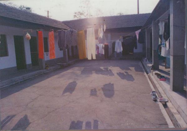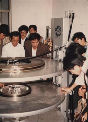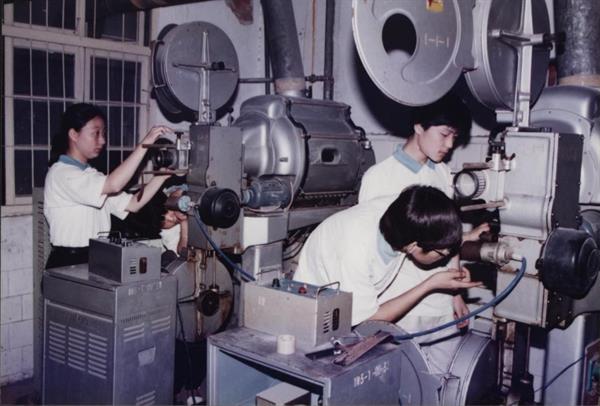1988年6月,座机班学生赴哈尔滨电影制片厂参观,图为师生参观影片制作冲洗过程