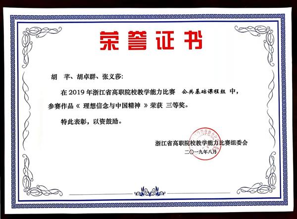 日前,由浙江省教育厅主办的2019年全省高职院校教学能力比赛在宁波落下帷幕,全省共46所高职院校228个团队参赛,139个团队获得奖项。我院选送的4个教师团队全部获奖,二等奖1项,三等奖3项,其中社会科学部教师、省级高校思政理论课名师工作室成员胡芊领衔团队获三等奖,实现我部在该奖项上的突破。