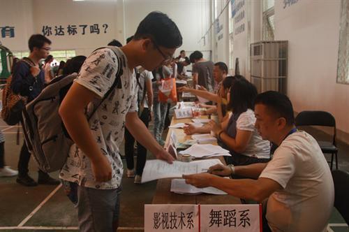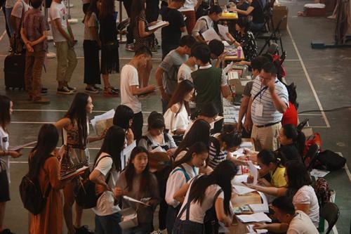 学院体育馆已早早开启迎新模式,横幅挂起来,指引牌贴起来,一溜桌子椅子排开来,学长学姐各就各位,引导答疑。认真的保安也一丝不苟地开始维持秩序,“对不起,家长留步,请让学生自己办理报到手续”。