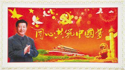 在展馆中厅的展墙上居中悬挂着长1.52米、宽0.8米的大幅绣匾。这幅绣匾以红色为基调,习近平总书记的肖像惟妙惟肖,金色的党徽、鲜艳的五星红旗、雄伟的天安门、庄严的华表、圣洁的和平鸽共同簇拥着七个金色的大字——“同心共筑中国梦”。