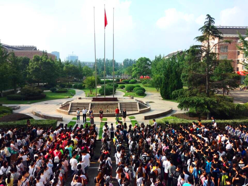新学期正式上课第一天,学院在中心广场举行升旗仪式,共同纪念中国人民抗日战争暨世界反法西斯战争胜利70周年。