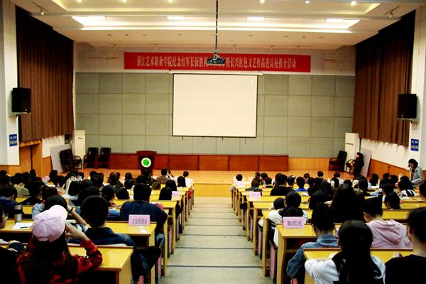 影视技术系学生党员余家荣同学作了发言。他讲述了在长征的艰苦条件下,共产党人克服重重困难,历经险难而又百折不挠的生动故事。他说:“长征精神,就是在枪林弹雨,雪山草地之间打不烂,拖不垮的硬骨头精神,这就是面对敌人的屠刀与诱惑,没有丝毫的奴颜和媚骨的大无畏精神!”他呼吁他们同学们弘扬长征精神,努力拼搏,去追寻金色的理想,最后他引用梁启超的名言 “少年兴则国兴,少年强则国强” 来激励大家为振兴中华而勤奋学习,明天为创造祖国辉煌的未来贡献自己的力量。刘月琴主持红色文艺作品推介会。作家田家村为同学们倾情讲述了长篇纪实文学《江南小延安》的写作心得,长兴县文化广电新闻出版局副局长汪敏与同学们深刻交流他所理解的广播剧《红色沃土》,新四军苏浙军区纪念馆馆长和讲解员们给同学们讲述许多抗战经典故事。黄杭娟、刘月琴代表校地双方一起向各系学生代表赠送红色文艺作品。