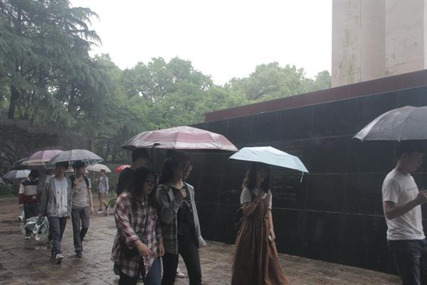 在绵绵细雨里,同学们撑着伞踏着青灰色的台阶向烈士纪念碑走去,一直往上走看到了一块黑色的碑上,碑上刻着裘古怀烈士的遗言:“同志们,胜利的时候,请你们不要忘记我们!”如此质朴简单的遗言,展现出了革命烈士最真挚的内心,他们牺牲自己,为了中华民族的存亡奋不顾身,他们不为名不为利,为的是能够实现自己的价值,面对烈士的遗言,我们的内心充满了火热,他们伟大的形象也会常存于每个人的心中。来到革命烈士纪念馆前,早有其他学校的同学也在举行悼念仪式,缅怀烈士是我们每个人都愿意和值得去做的。在庄严肃穆的革命烈士纪念碑前,伴随着义勇军进行曲我们唱响了国歌,领导老师冒雨做出了缅怀烈士的讲话,献花仪式结束后我们全体学员绕纪念碑一圈感受革命烈士的伟大,在纪念碑的背面写着浙江革命烈士纪念馆是由社会各界人士捐款建造于一九九一落成,结尾的那句话“青山有幸,英烈永存;巍巍丰碑,千古扬名。”是对英烈的赞颂,是历史与人民将会永记他们的决心。