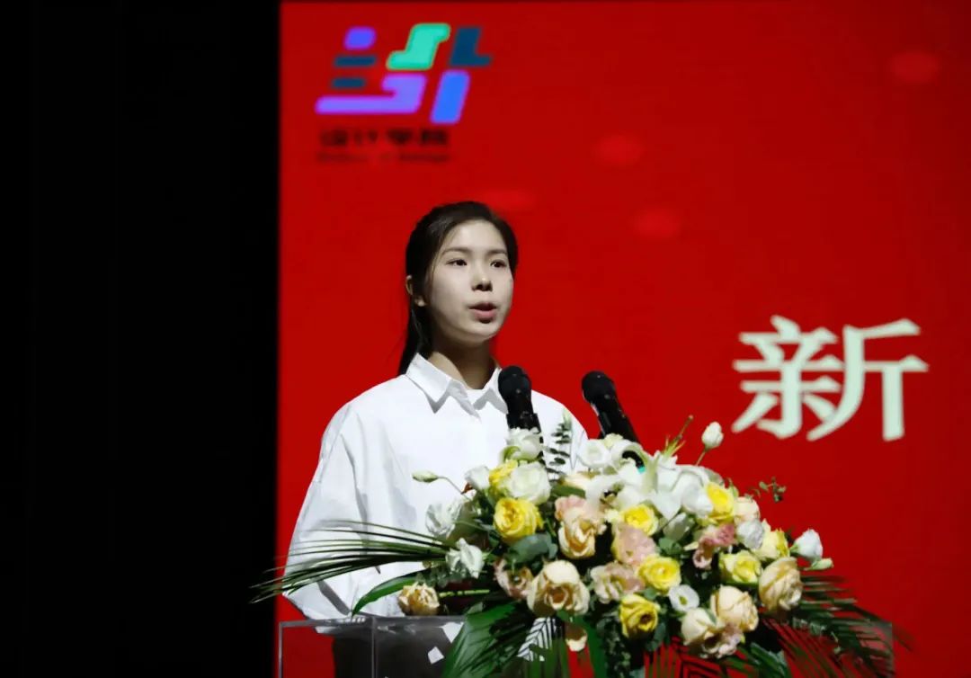 23舞美2班的王露贝同学作为新生代表发言。她以未来的目标和规划与同学们共勉,号召全体新生在不懈追求进步中长出丰满的羽翼、练就坚韧的意志、提升尽善尽美的艺术境界。