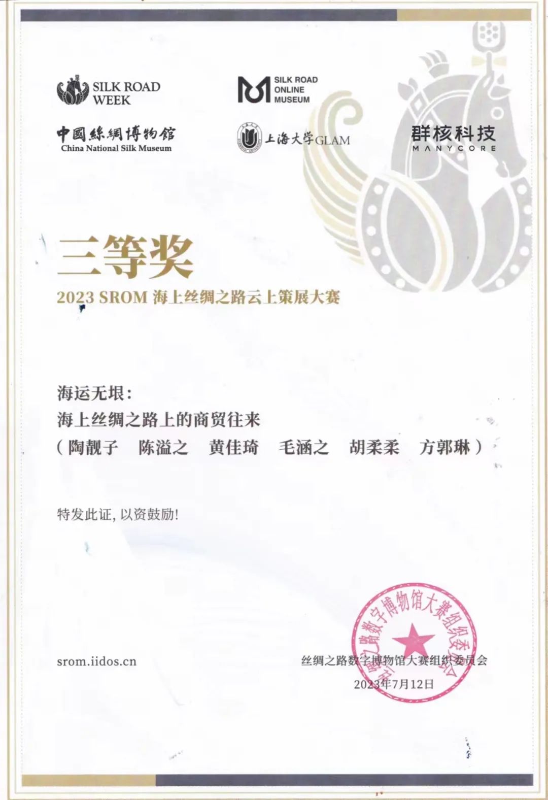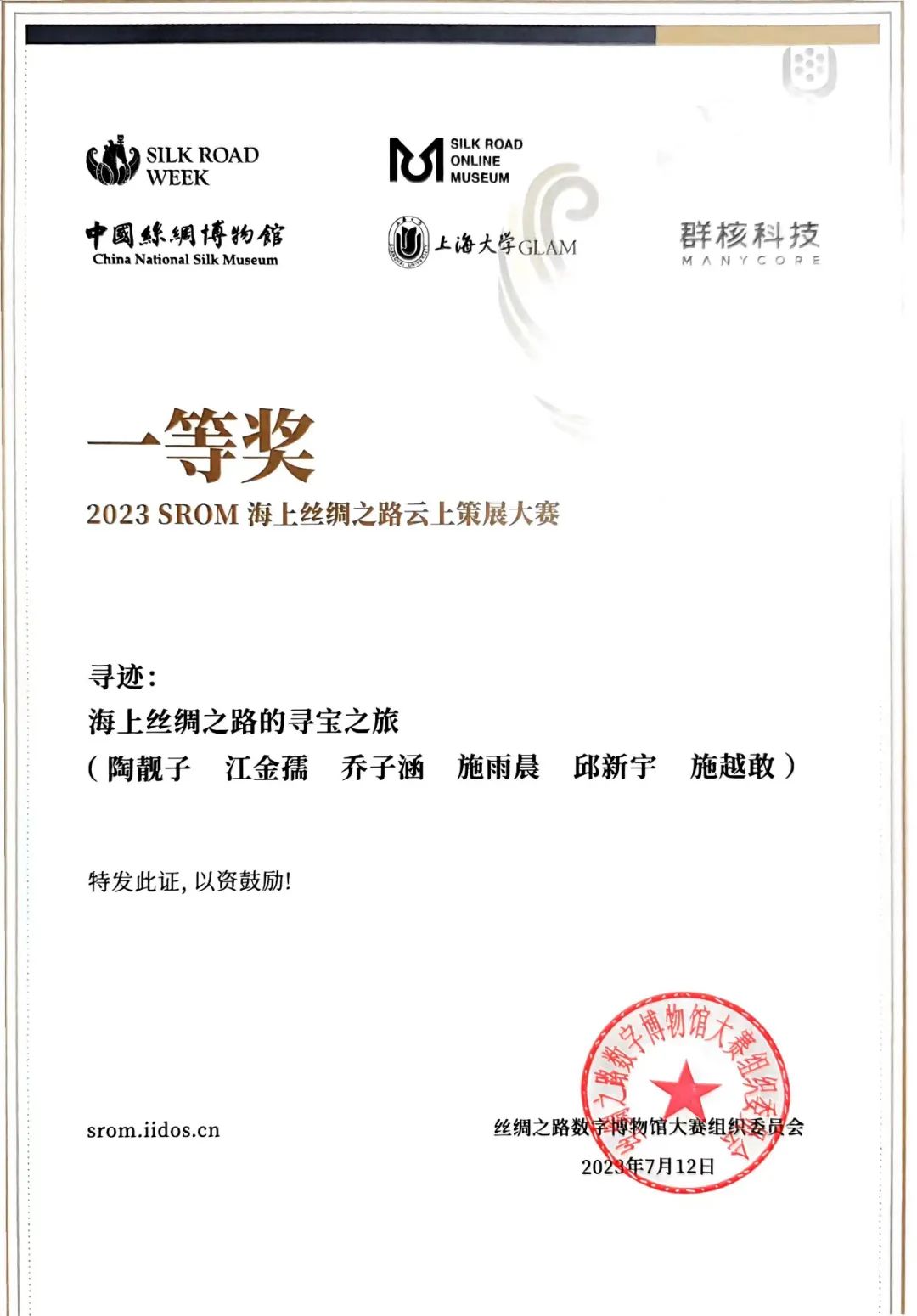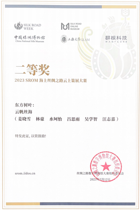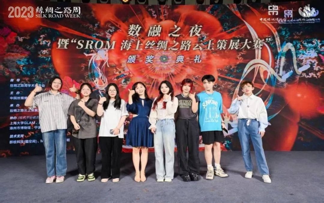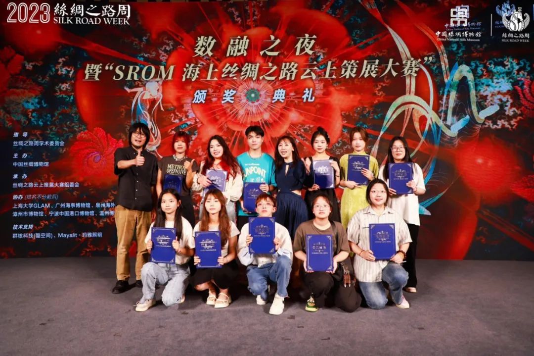 “丝路之夜·数融之夜”暨“SROM海上丝绸之路云上策展大赛”颁奖典礼于暑期在中国丝绸博物馆隆重揭幕。中国博物馆协会理事长刘曙光,中国丝绸博物馆馆长季晓芬,浙江省博物馆馆长陈水华,中国茶叶博物馆馆长包静,中国美术学院公共艺术学院客座教授、原敦煌研究院美术研究所副所长谢成水,匈牙利国家博物馆中国代表、匈牙利佰路得执行总监Steven Back贝思文,法国里昂丝织艺术博物馆代表Julia Sabine Florence Gazeres,泰国诗丽吉王后纺织博物馆代表Nachanok Paint Wongkhaluang,浙江艺术学院设计学院院长李昌国等人以及SROM大赛的获奖选手队伍参加出席了本次晚会。晚会现场人数近百人,线上直播观看量达200万。