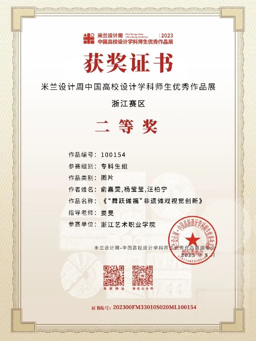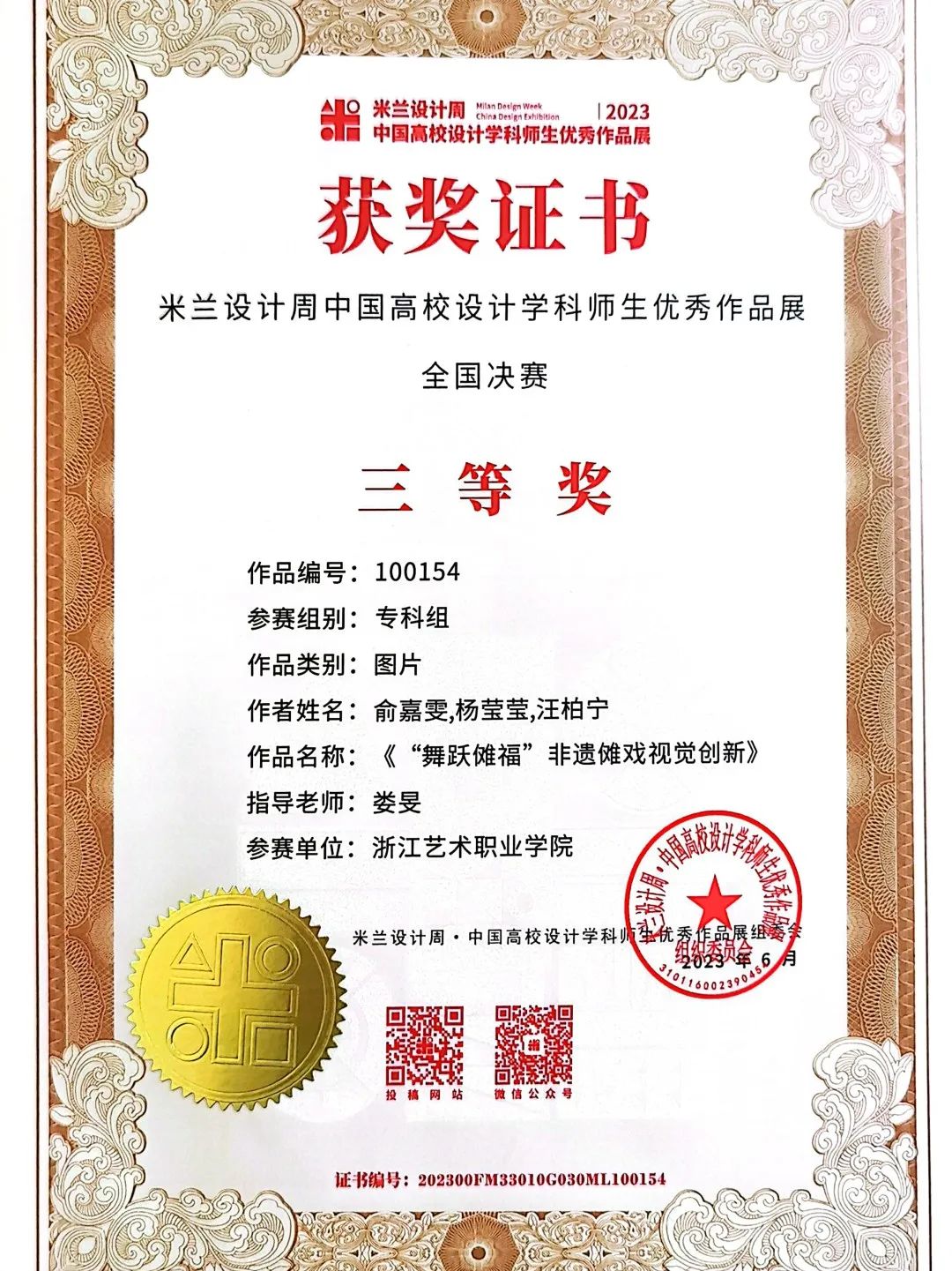 为提高学生运用知识解决实际问题的能力,积极鼓励学生参加各类专业竞赛,培养具有创新精神和实践能力的高素质技术技能人才。近日,由设计学院各专业教师指导的学生作品在2023“米兰设计周——中国高校设计学科师生优秀作品展”中喜获佳绩。经过校内选拔、浙江赛区选拔,作品获得国赛一等奖1项,三等奖1项;浙江赛区获省一等奖1项,二等奖4项,三等奖5项的好成绩。