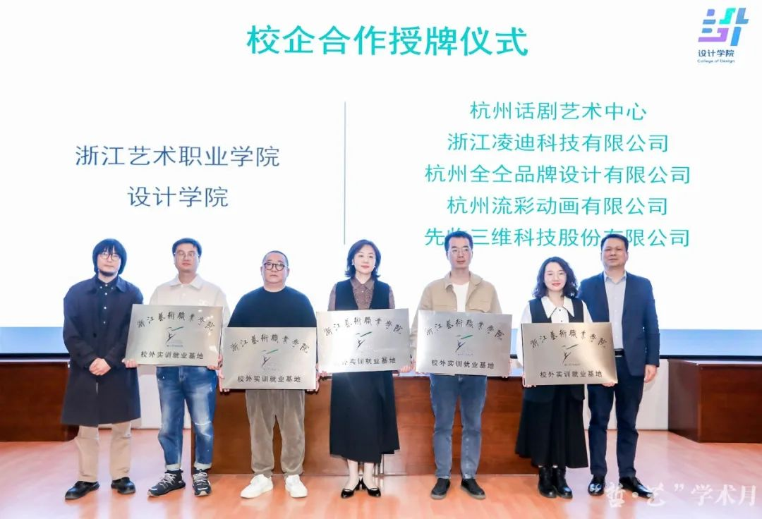 设计学院分别与杭州话剧艺术中心、浙江凌迪数字科技有限公司、杭州全仝品牌设计有限公司、杭州流彩动画有限公司、先临三维科技股份有限公司签订产学合作实践教学基地合作协议及授牌,进一步深化校企合作,协同育人。