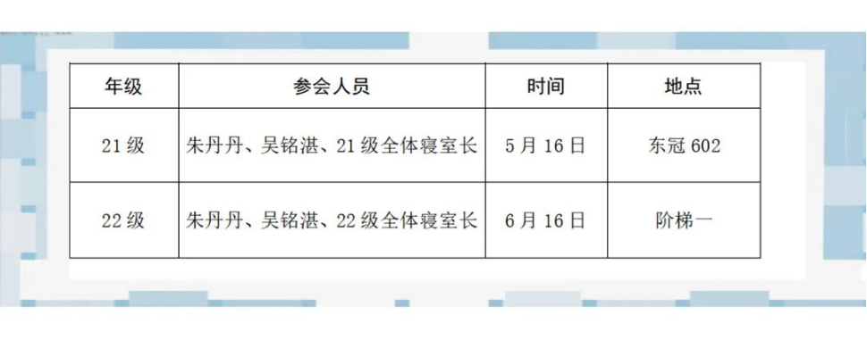为进一步加强学生教育管理,增进与学生的沟通交流,了解同学们的需求,更好地把握学生思想动态,同心协力完成22级学生寝室搬迁工作和学生期末离校工作,设计学院召开“舍长有约”寝室长会议。具体安排如下: