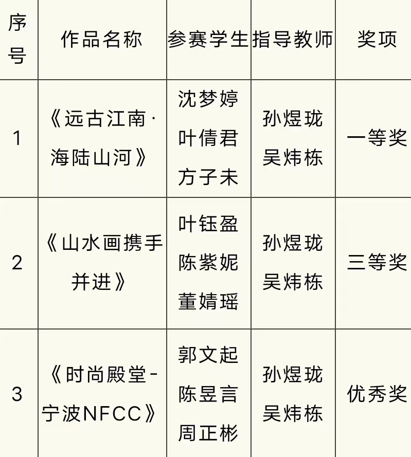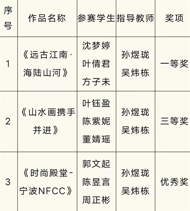 12月6日,由宁波市教育局、宁波市服务业发展局联合主办的2023全国(宁波)高校会展创意设计大赛颁奖典礼在浙江纺织服装职业技术学院圆满落幕。我院动漫设计专业师生代表参加了此次2023全国(宁波)高校会展创意设计大赛颁奖典礼。