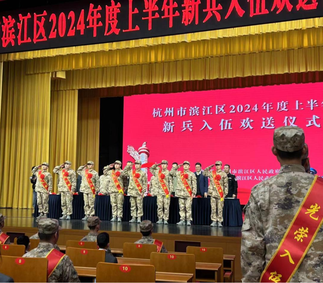 莘莘学子携笔从戎,参军报国建功立业。3月15日,杭州市滨江区2024年度上半年新兵入伍欢送仪式在区文化中心二层大礼堂举行。设计学院21服装与服饰设计班学生吴浩东经过体检、政考、审批定兵等环节层层选拔光荣入伍。设计学院党总支副书记汪仕龙,班主任王艺璇,保卫处干事茹叶辉参加仪式。