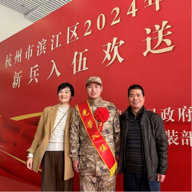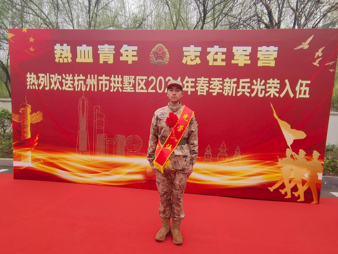 当日,在杭州市拱墅区参加征兵仪式的还有23环境艺术设计2班的殷天赐,他平日里与同学们相处得十分融洽,虽话语不多,却总能在无声处见真章。在学习上积极进取,生活中严格自律,乐于助人、无私奉献,获得了老师和同学们的一致认可。