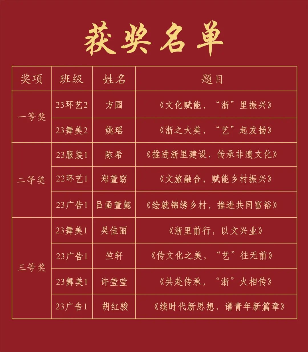 经过前期初赛选拔,共有9名学生入围比赛。参赛选手们紧扣“习近平文化思想在浙江的生动实践”主题,从小处着眼、细处入手,结合身边相关故事、案例和实践活动,充分展现了设计学子独有的蓬勃朝气以及追寻理想的拼搏干劲。经过现场激烈的角逐,方园、姚瑶获一等奖,陈希、郑萱窈、吕函萱懿获二等奖,吴佳丽、竺轩、许莹莹、胡红骏获三等奖。