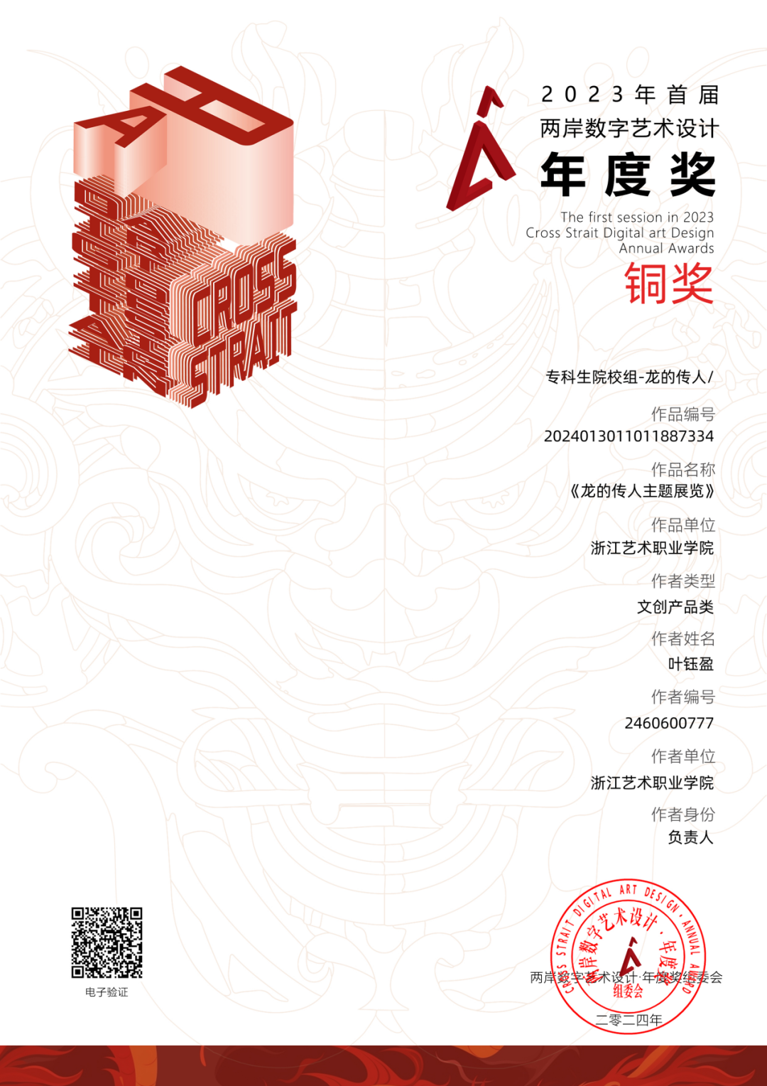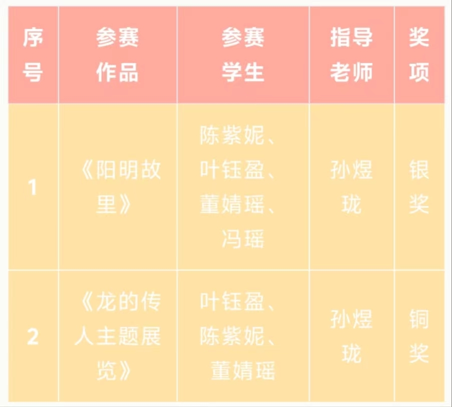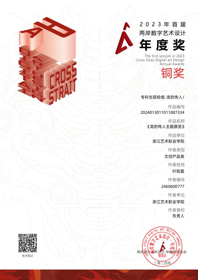 近日,由海峡两岸交流促进会、台湾旅游和文化协会牵头,台湾国际文化创意产业发展协会、高教创赛云竞赛服务平台及两岸文创单位和多所大学协办的2023首届两岸数字艺术设计·年度奖获奖结果公布。本届赛事共征集到来自全国各地的命题赛道“龙的传人”及非命题赛道共计41531项参赛作品,参赛总人数达8.7万人,参赛院校及单位共1521所。设计学院动漫设计专业专业带头人孙煜珑所指导的2022级动漫设计专业陈紫妮、叶钰盈、董婧瑶、冯瑶同学的作品《阳明故里》荣获该赛项银奖,叶钰盈、陈紫妮、董婧瑶同学的作品《龙的传人主题展览》荣获该赛项铜奖。